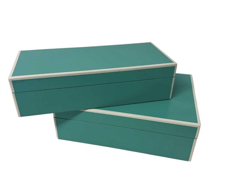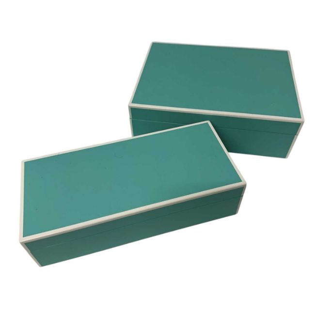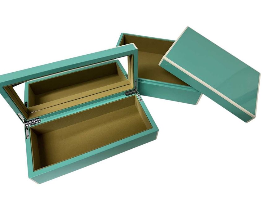 Two good quality 'Swing Design' turquoise lacquer boxes, one with hinged lid and inset mirror, the other with removable lid, 25.5cm wide x 11.5cm deep x 7cm high and 24.5cm wide x 18cm deep x 8cm high