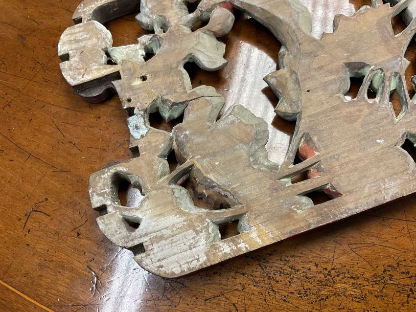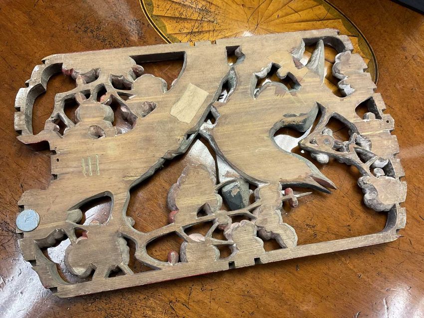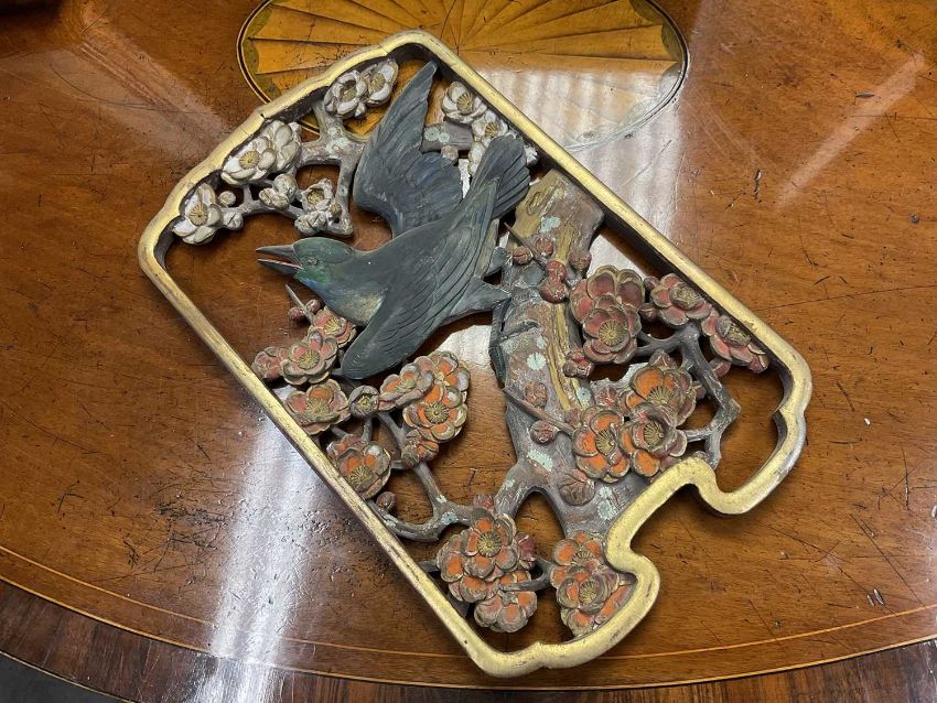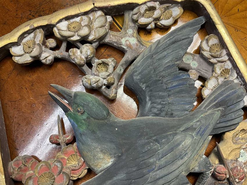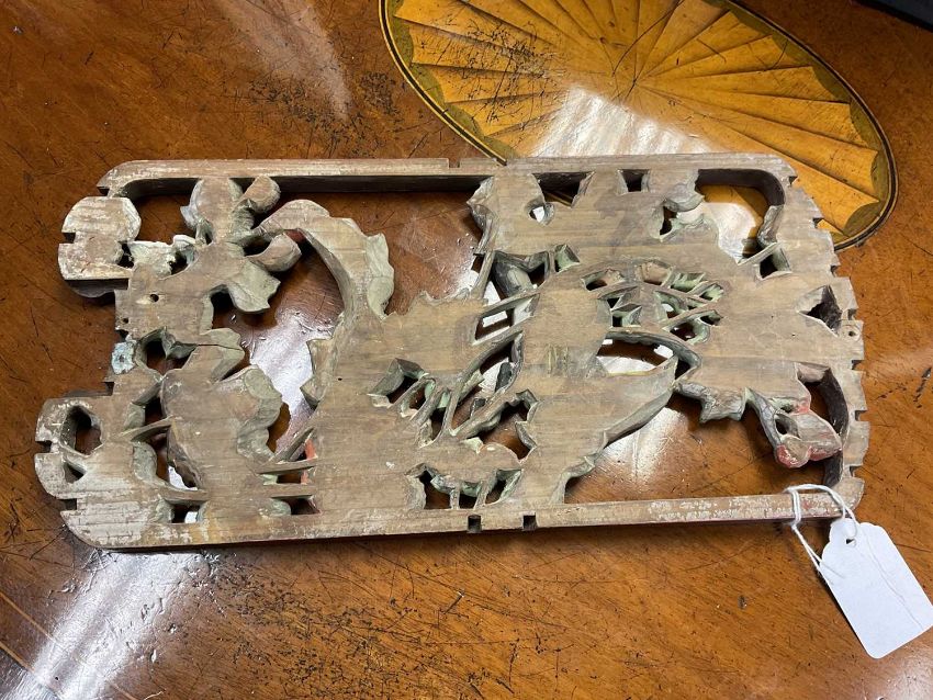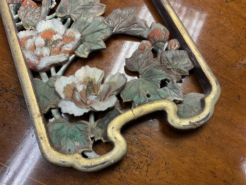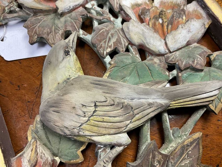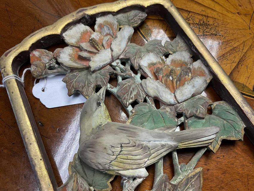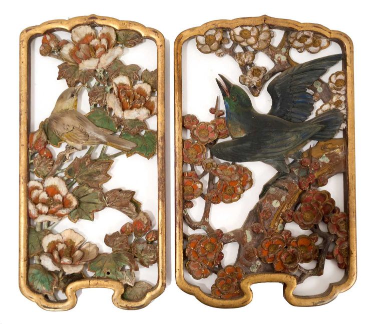 Pair of early 20th century Chinese carved and pierced panels, carved with birds and foliage, with polychrome and gilt ornament, each 31cm high