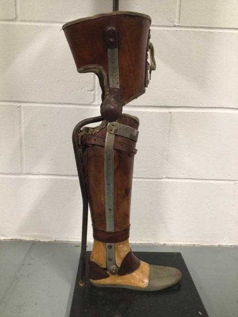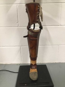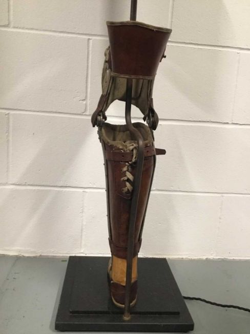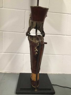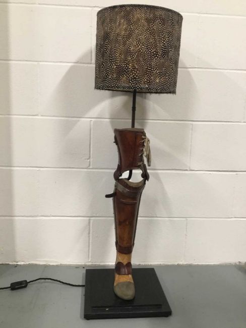 Vintage Prosthetic Leg lamp with Guinea fowl drum shade, 104cm high with shade, on 30cm x 30cm base