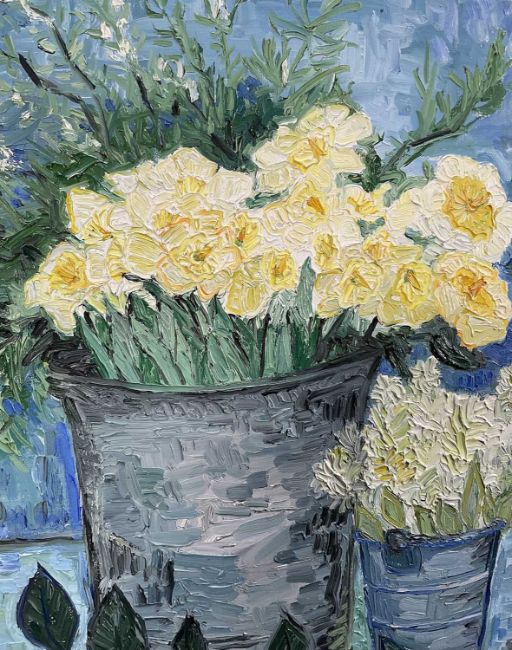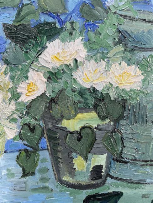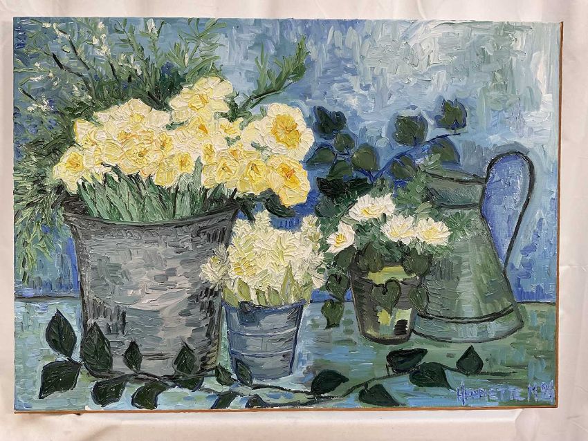 20th Century oil on canvas - still life of flowers and a jug, signed Happiette M, dated '94, 50cm x 70cm, unframed