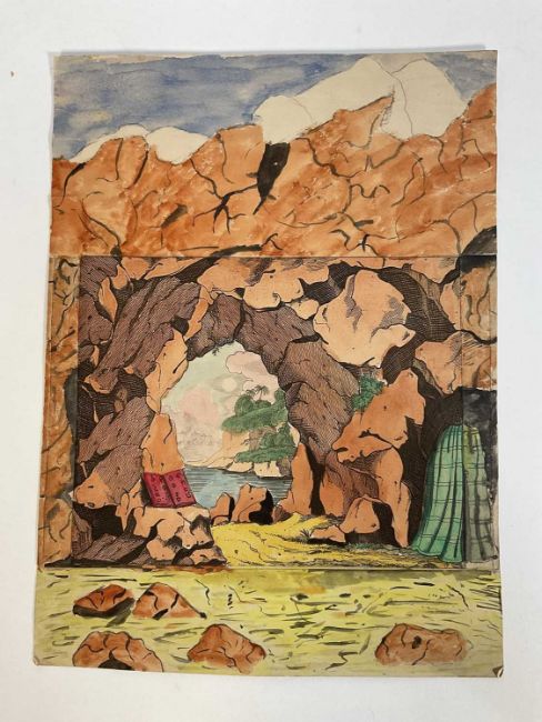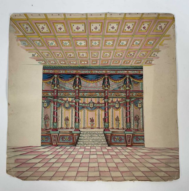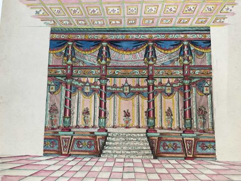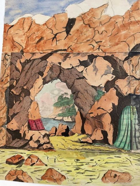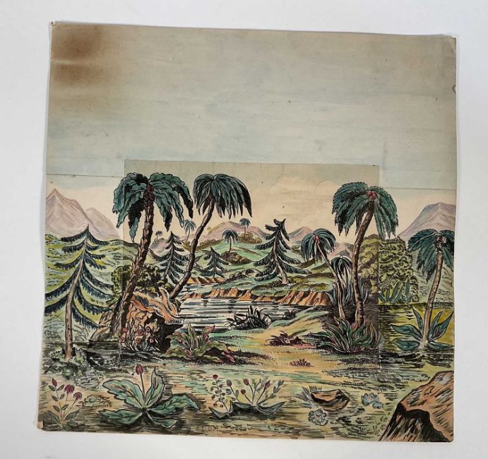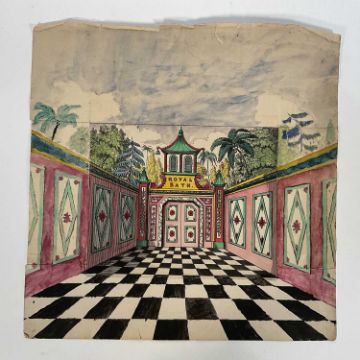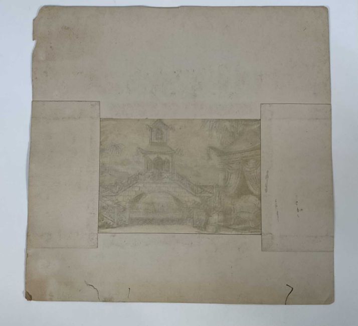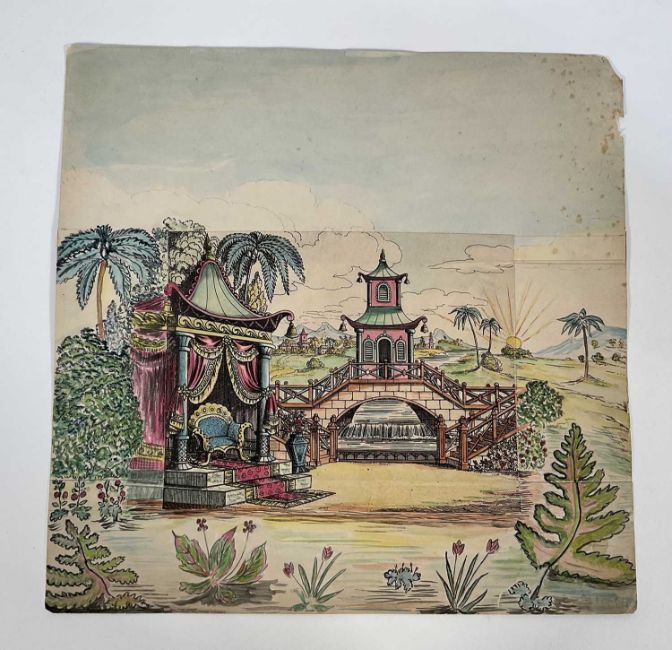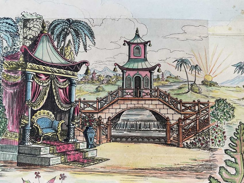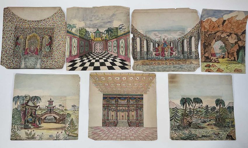 Decorative group of seven part-hand-painted part-printed sets for a toy theatre depicting temples and landscapes, average size 32cm square