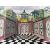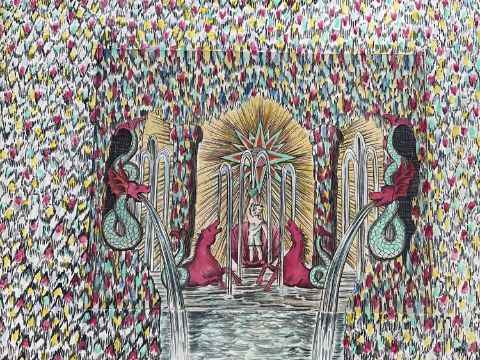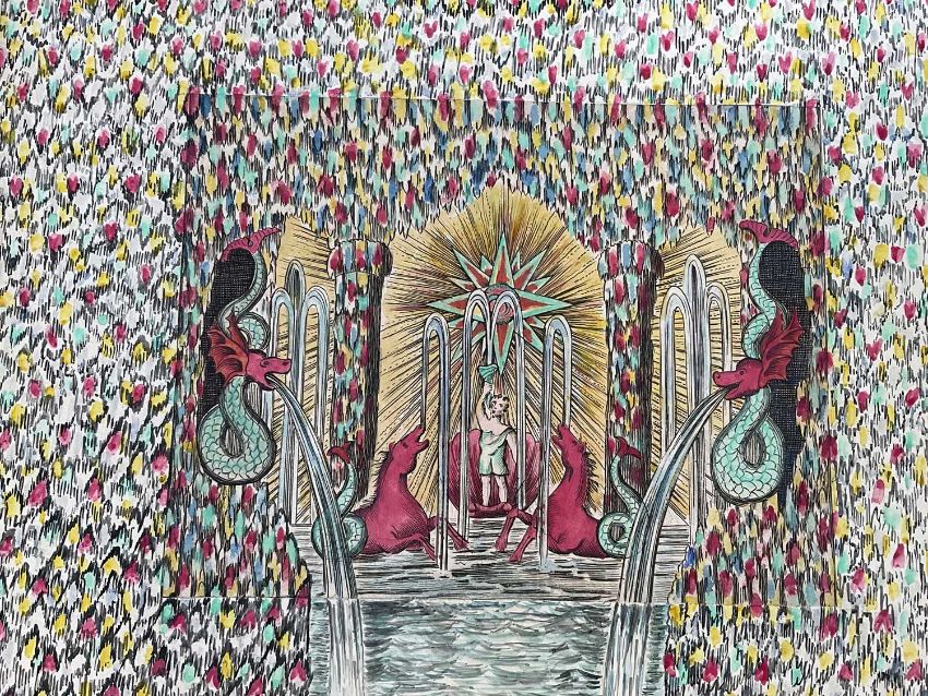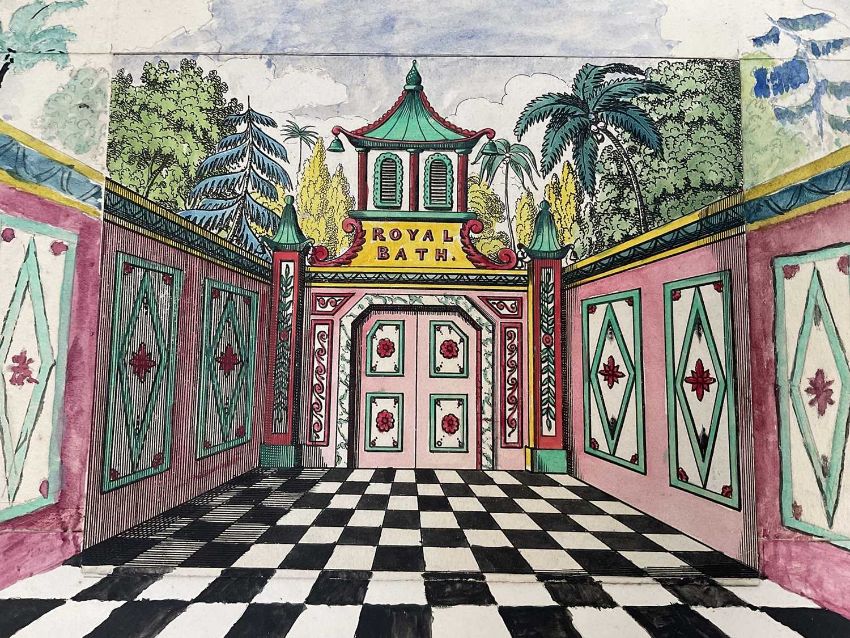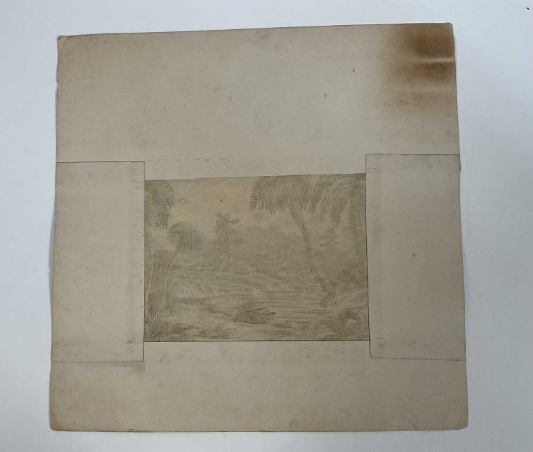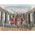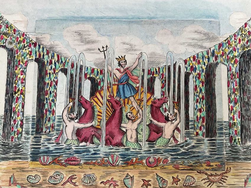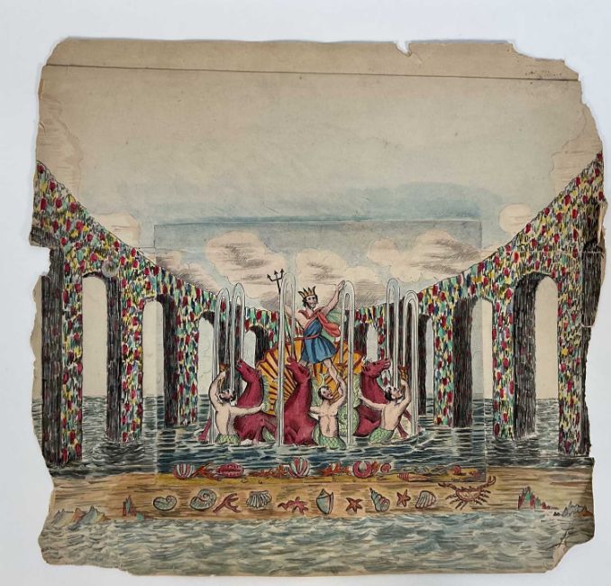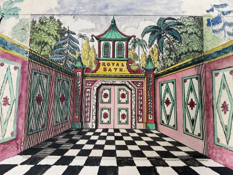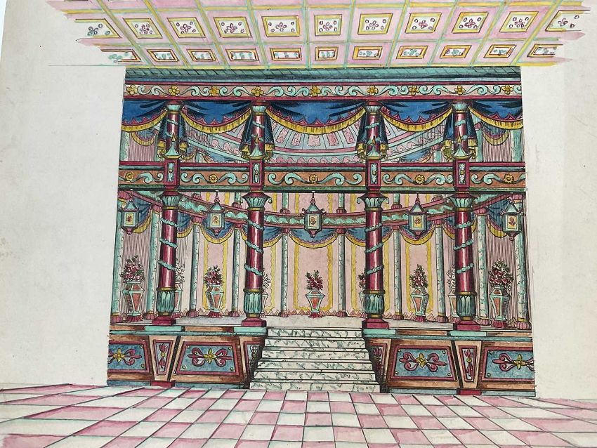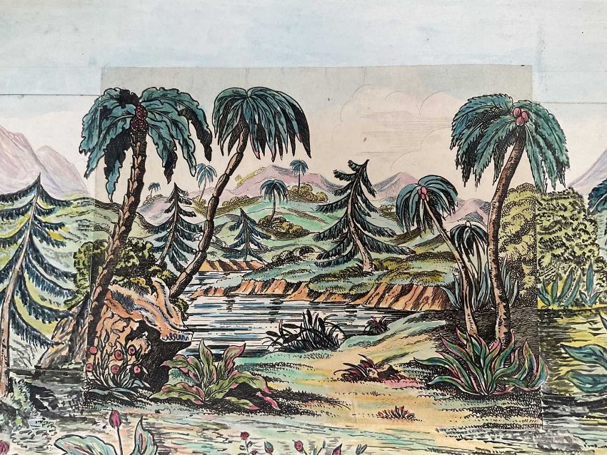 Decorative group of seven part-hand-painted part-printed sets for a toy theatre depicting temples and landscapes, average size 32cm square