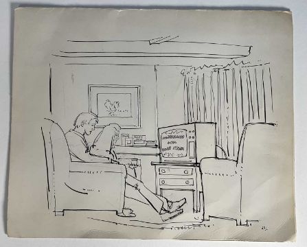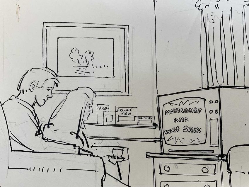 Richard Stone (b. 1951) original pen and ink card inscribed to Eric Morecambe from Richard Stone, wishing him well on his new ITV series, 1978, with humorous illustration, 23 x 27cm