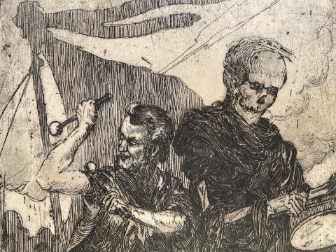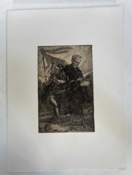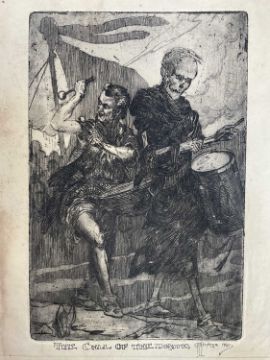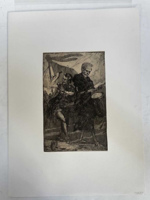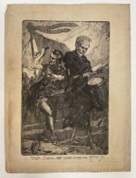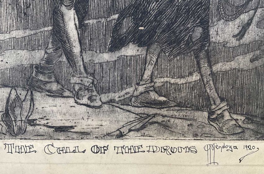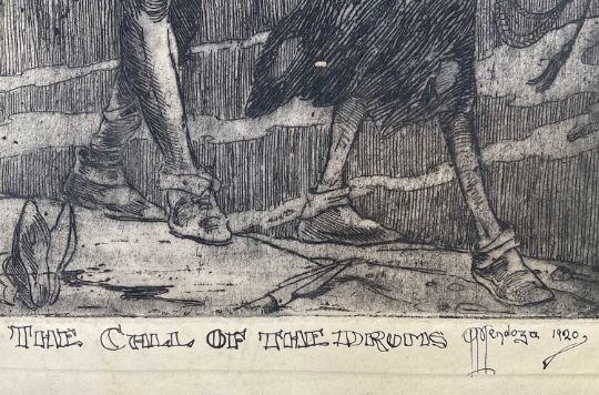 P. Mendoza, early 20th Century etching - The Call of the Drums, signed, titled and dated 1920, 30cm x 20cm, unframed