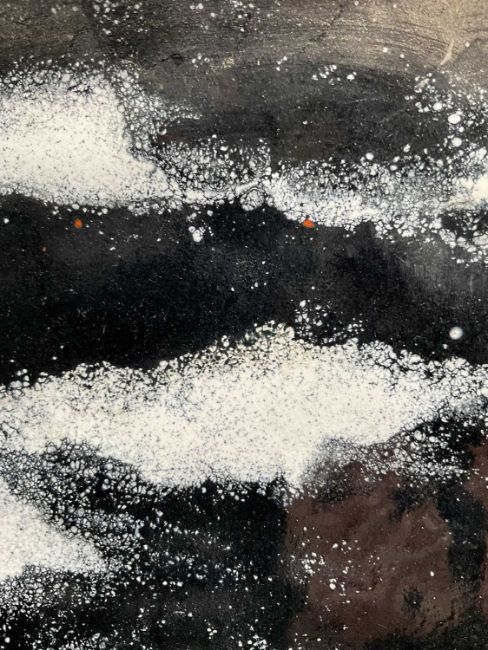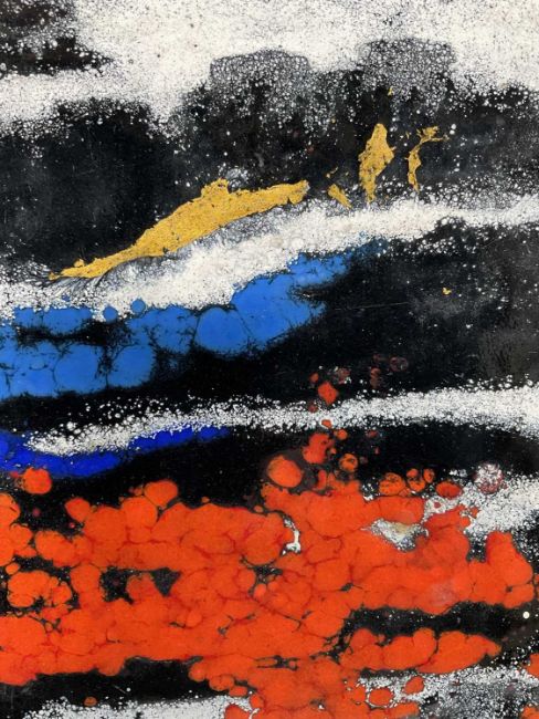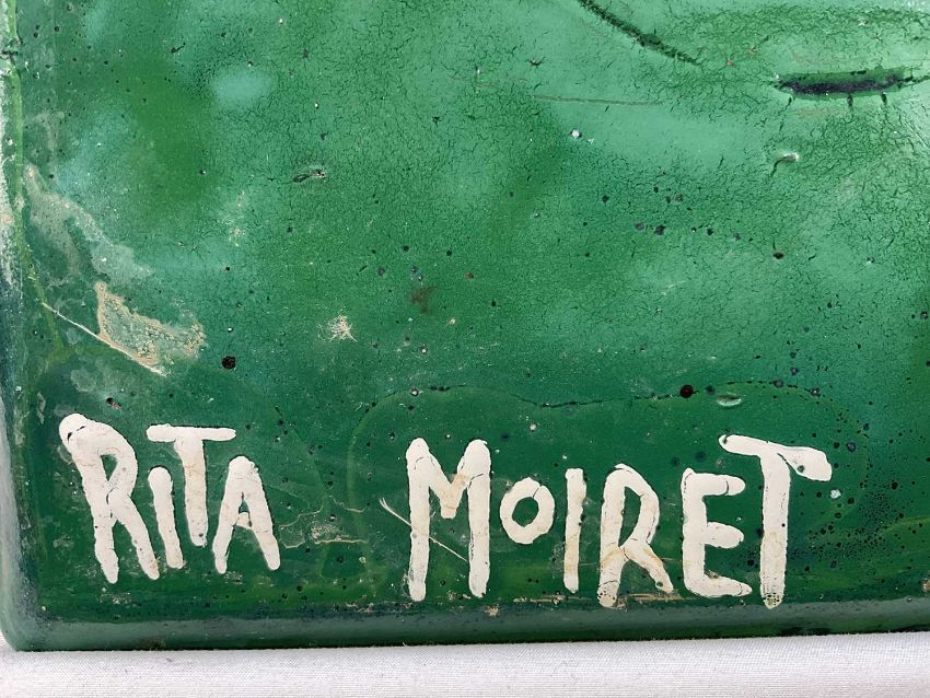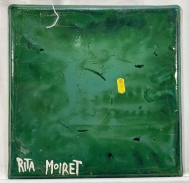 Rita Moiret (1912-1994) enamel composition, abstract, in tray form, signed verso, 30cm x 30cm