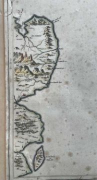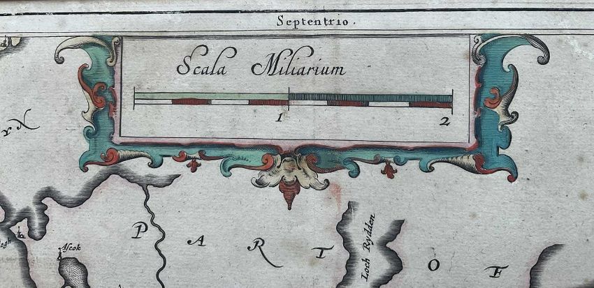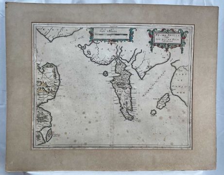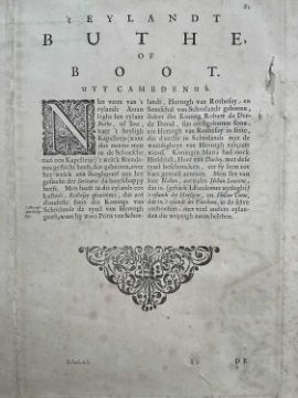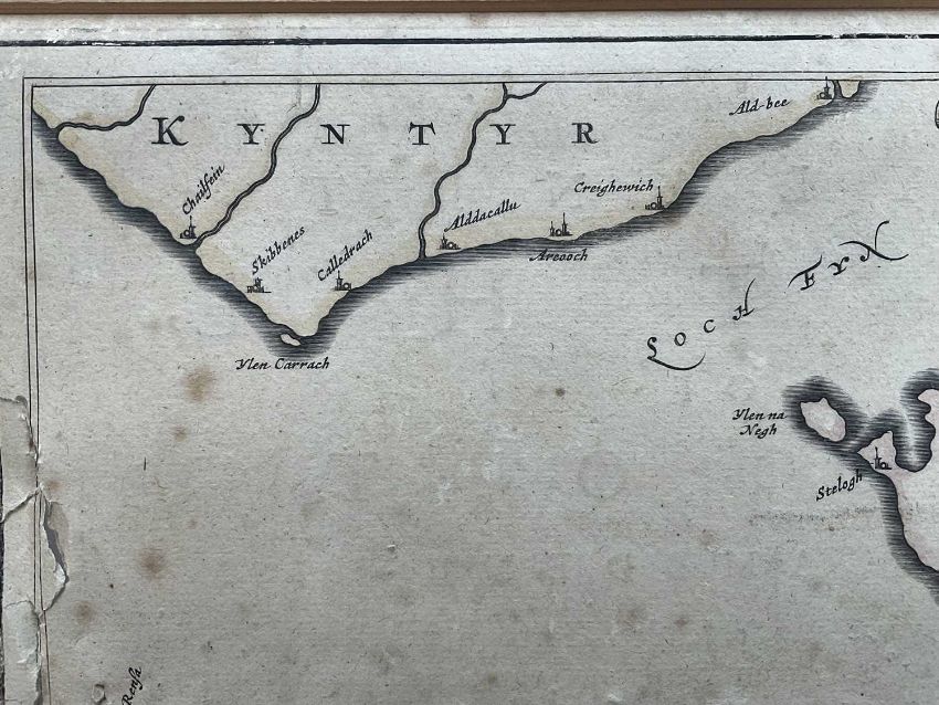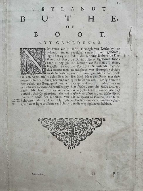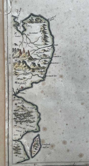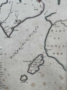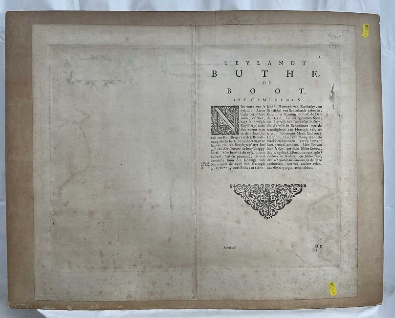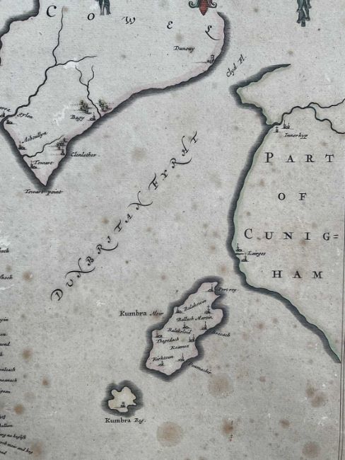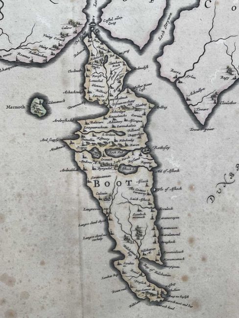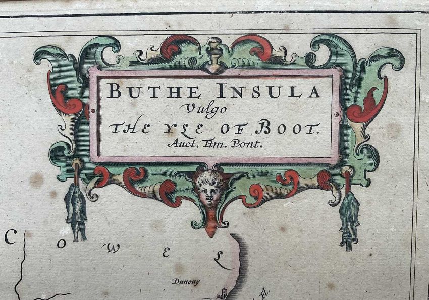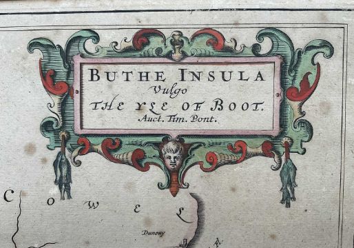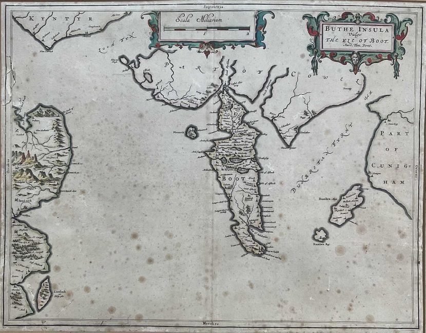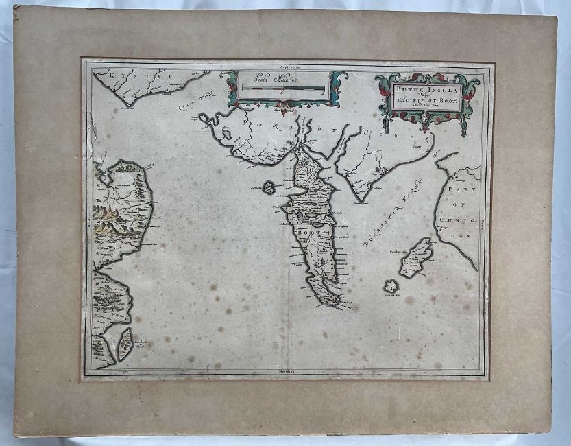 Timothy Pont, 17th century hand coloured engraved map, the Isle of Bute, 'Buthe Insula Vulgo, The Yse Of Boot', 40cm x 52xm, mounted