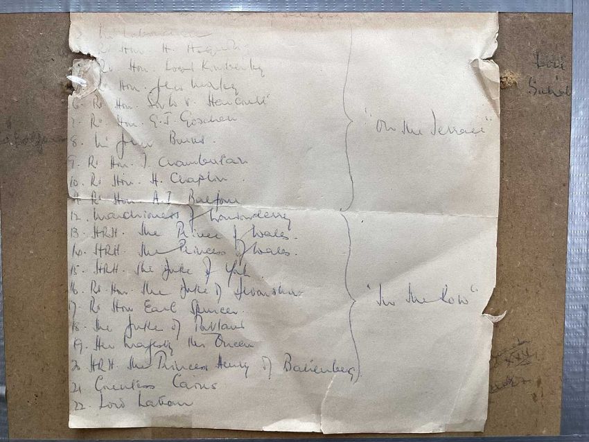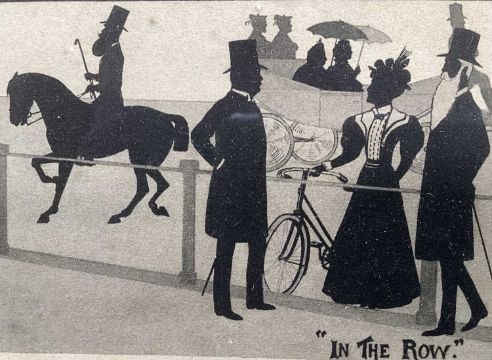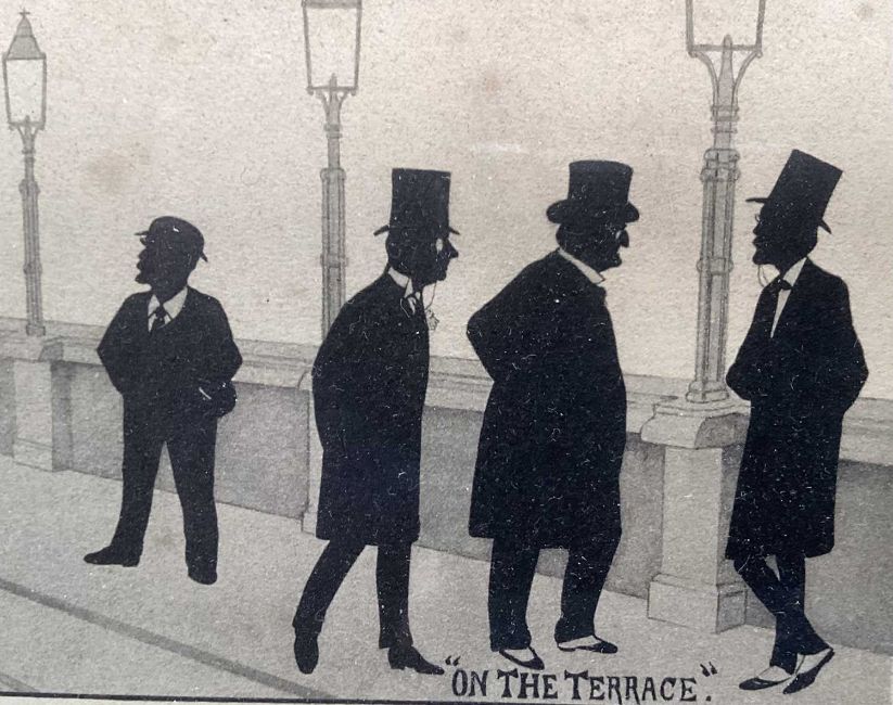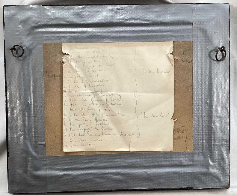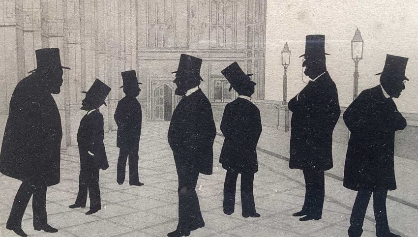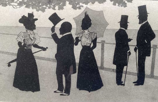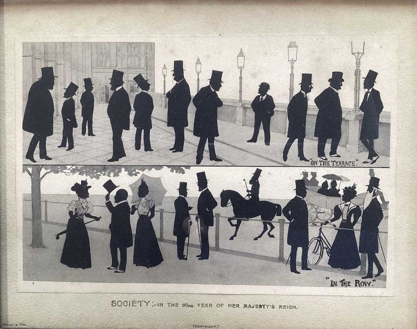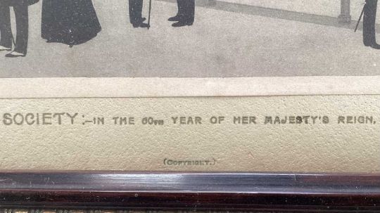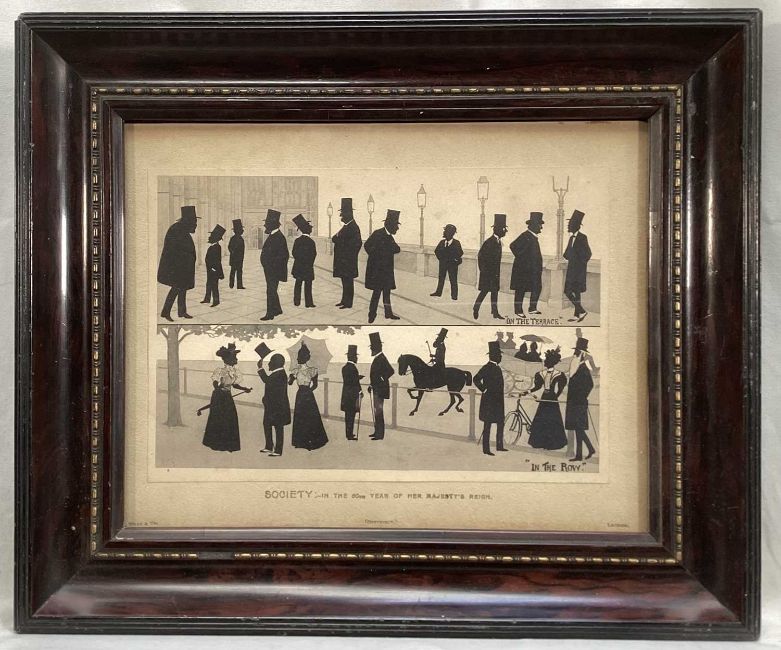 Victorian printed silhouette - 'Society, in the 60th year of Her Majesty's Reign', a hand written list verso of the various figures, 18.5cm x 23.5cm, in glazed frame
