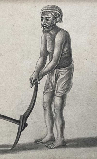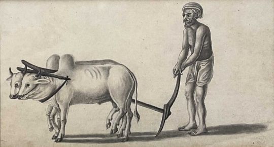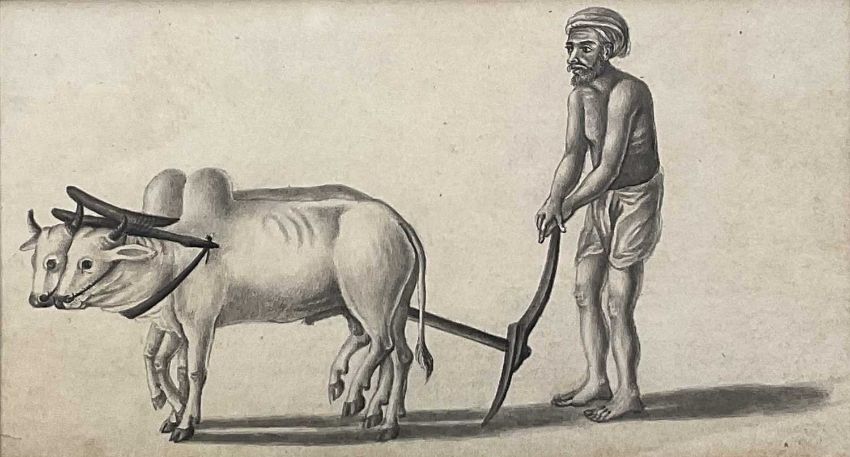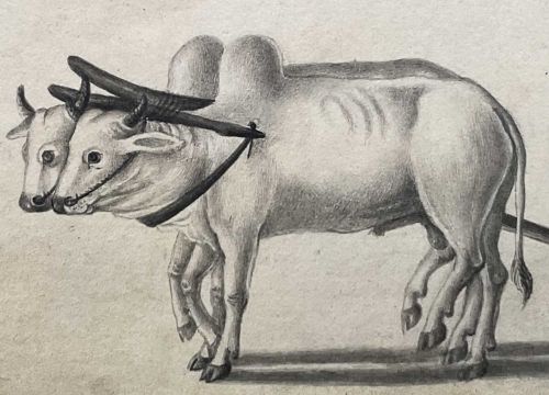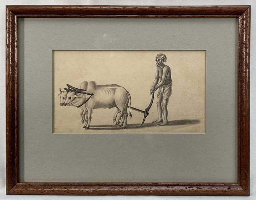 19th century Indian school pencil - plough team, 8cm x 15cm, in glazed frame