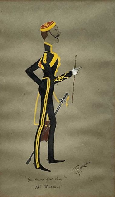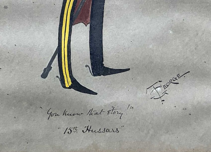 T. George, pair of early 20th century pen, ink and watercolour military cartoons - The 15th Hussars, titled "You know that story" and "Alright Bob", signed and titled, in glazed gilt frames, 32cm x 19cm